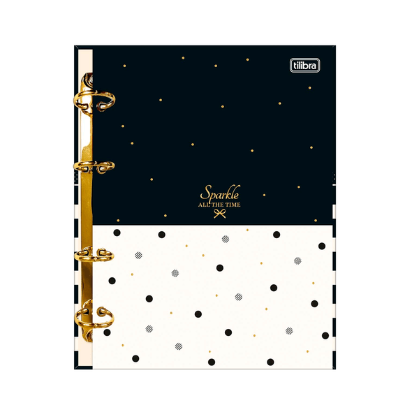 O caderno argolado Tilibra possui capa dura com detalhe metalizado e parte interna decorada, oferecendo um visual moderno e sofisticado. O produto também vem com adesivos, bolsa plástica para guardar trabalhos e anotações, jogo com seis divisórias e refil de 80 folhas pautadas e decoradas.