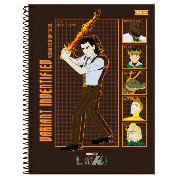 O caderno espiral universitário Loki possui capa dura com laminação fosca com a parte interna decorada, verniz reserva, bolsa plástica para guardar trabalhos e anotações, folha com adesivos funcionais, pauta básica e espiral preto. Ideal para o dia a dia na escola ou na faculdade.