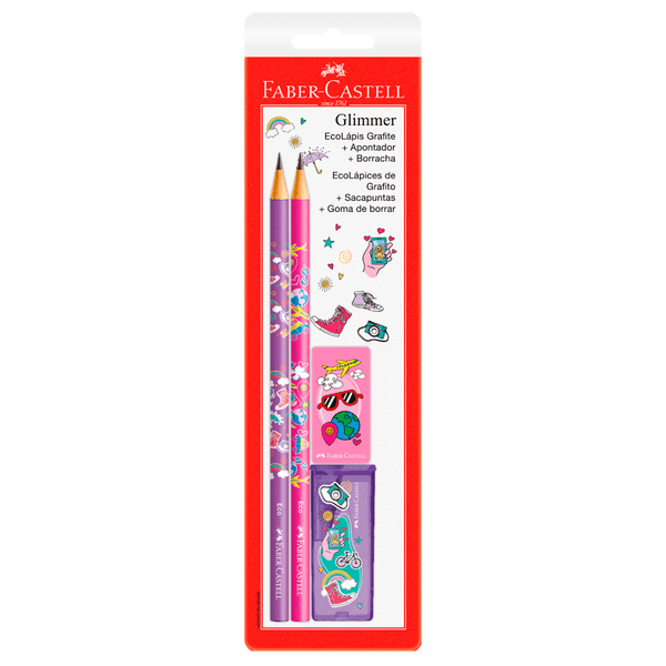 A família Glimmer agora em um kit completo com 2 EcoLápis Grafite + 1 apontador com depósito + 1 borracha! Seus novos melhores amigos na hora de escrever, desenhar, apontar e apagar em uma combinação exclusiva de rosa e roxo no tema Glimmer Viagem que chegaram para completar o seu estojo! Kit completo para te acompanhar. Design exclusivo Faber-Castell Ponta resistente e escrita macia Madeira certificada e sustentável - FSC Apontador com depósito que garante maior praticidade e lâminas de aço temperado Borracha com formulação de alta qualidade e livre de PVC.
